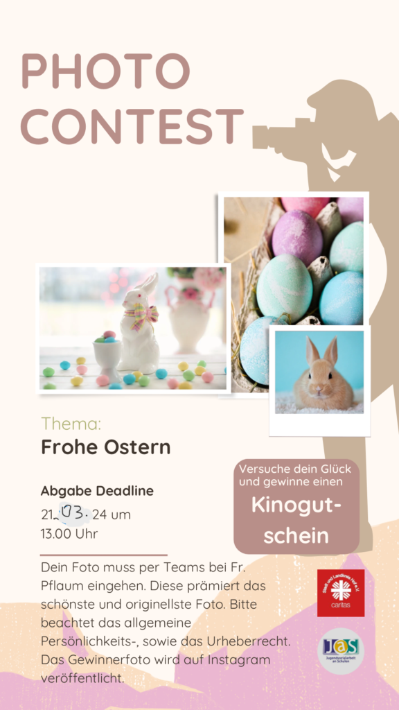 Startseite » Aktuelles » Gewinne einen Kinogutschein: Fotowettbewerb Frohe OsternGewinne einen Kinogutschein: Fotowettbewerb Frohe Ostern Abgabe bis 21. März 2024 um 13 Uhr bei Frau Pflaum. Du kannst einen Kinogutschein gewinnen. Schlagwörter:Foto