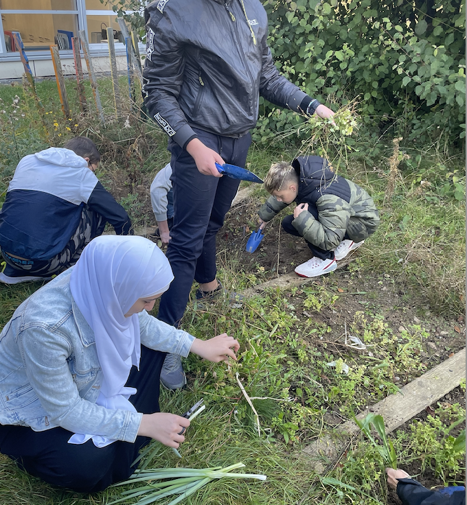 Die Schüler der Klasse 9b haben den Schulgarten erfolgreich winterfest gemacht. Bei der letzten Ernte konnten sie Möhren, Mangold, Frühlingszwiebeln, einen kleinen Kohlrabi, eine kleine Rote Bete, Zucchini und kleine Gurken einsammeln. Auch die Paprikapflanzen wurden ausgegraben, um sie im Klassenzimmer über den Winter zu bringen. So bleibt ein Teil des Gartens auch in den kalten Monaten erhalten.